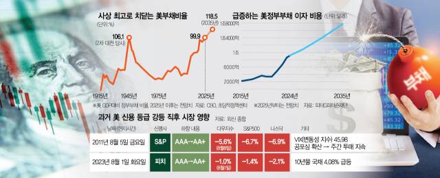 시장이 걱정하는 대목은 이 같은 부채 문제가 미국의 경제적 위상을 해칠 수 있는 단계에 접어들고 있다는 점이다. 영국의 대표적인 경제역사학자인 니얼 퍼거슨은 “역사적으로 나랏빚에 대한 이자 비용이 군사비를 넘어서기 시작한 시점에 강대국은 몰락의 길로 접어들었다”며 이를 ‘퍼거슨의 법칙’이라고 명명했다. 미국은 지난해 처음으로 국채 이자 비용(8820억 달러)이 국방비(8740억 달러)를 넘어섰다. 미 의회예산국은 올해는 물론 2035년에도 이런 추세가 계속될 것으로 보고 있다.