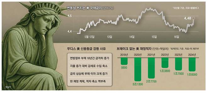 16일(현지시간) 국제신용평가사 무디스가 미국의 국가 부채 확대를 이유로 국가신용등급을 강등하자 시장에서는 '셀 아메리카(미국 자산 투매)'로 이어질까 촉각을 곤두세우고 있다. 미국 재정적자 확대에 따른 국가 부채 문제가 지속될 수 있다는 무디스의 경고로 인해 금융시장 변동성 확대가 불가피하다는 분위기다.