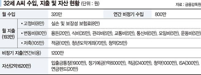 32세 A씨 월 수입은 320만원이다. 이와 별도로 연간 비정기 수입은 800만원이다. 월 지출은 193만원이다. 고정비는 실손 및 보장성 보험료 8만원이 나간다. 변동비는 80만원이다. 용돈(20만원), 식비(35만원), 관리비(5만원), 교통비(5만원), 통신비(5만원), 모임비(5만원), 운동비(5만원) 등이다. 저축은 적금(10만원), 청년도약계좌(70만원), 청약(25만원) 등 105만원씩 하고 있다. 연간 비용은 1200만원이다. 자산은 2억1620만원이다. 입출금통장(1900만원), 정기예금(1억6000만원), 적금(2400만원), 청약(1000만원), ISA(300만원), 연금펀드(20만원) 등이다. 부채는 따로 없다.