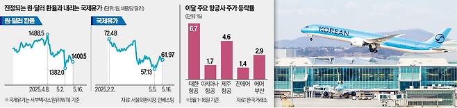 대다수 항공사가 운항비용 절감 효과를 보고 있다는 분석이 주가를 밀어 올렸다. 지난해 12·3 비상계엄 이후 1400원대까지 치솟은 원·달러 환율은 지난 16일 반년 만에 가장 낮은 1380원대로 하락했다. 항공사들은 항공기 매입대금과 연료비의 절반가량을 외화로 지급한다. 원·달러 환율이 낮아질수록 비용이 줄어드는 구조다.