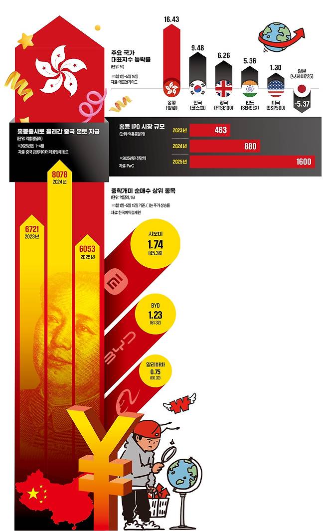 올 들어 홍콩증시 상승세가 글로벌 주요국 가운데 최상위권을 달리고 있다. 연초 중국의 저비용·고효율 인공지능(AI)인 딥시크 등장으로 인한 기술주 훈풍에 이어 정부의 경기 부양책, ‘애국 투자’ 열기까지 더해지며 투자금이 빠르게 유입되고 있다. 미·중 관세협상 성공 소식에 이어 세계 최대 전기자동차 배터리 제조사인 CATL의 기업공개(IPO)까지 임박해 당분간 홍콩과 중국 증시 상승세가 이어질 것이라는 전망이 짙어지고 있다.
