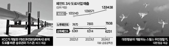 이미 수익화한 곳도 있다. KCC는 땅 밑, 해저를 지나는 송유관·가스관용 분체페인트를 출시해 판매를 시작했다. 가루 형태인 분체페인트는 휘발 성분이 없어 중독, 화재, 공해 위험이 낮은 데다 흘러내리지 않아 차세대 산업용 페인트로 떠오르고 있다. KCC가 개발한 퓨전본딩에폭시(FBE) 분체도료는 대형 인프라 프로젝트에서 철근, 파이프, 밸브 등의 부식을 방지하기 위해 쓰인다.