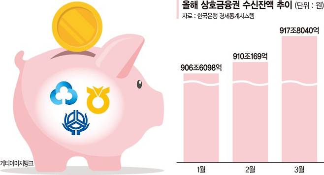 18일 한국은행 경제통계시스템에 따르면 농협·신협·새마을금고 등 상호금융권의 지난 3월 말 수신잔액은 917조8040억원으로 집계됐다. 전월 말(910조169억원) 대비 7조원 이상 늘었다.