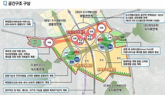 개발계획은 사업대상지 규모와 순환골재적치장 처리 시기 등을 고려해 중봉대로를 기준으로 동측 생활권(사월마을 일대)과 서측 생활권(순환골재적치장 구간)으로 분리하되, 녹지축 연계와 생활권 중심지 연결계획 등을 통해 통합·체계적인 마스터플랜을 수립한 것이 특징이다.
