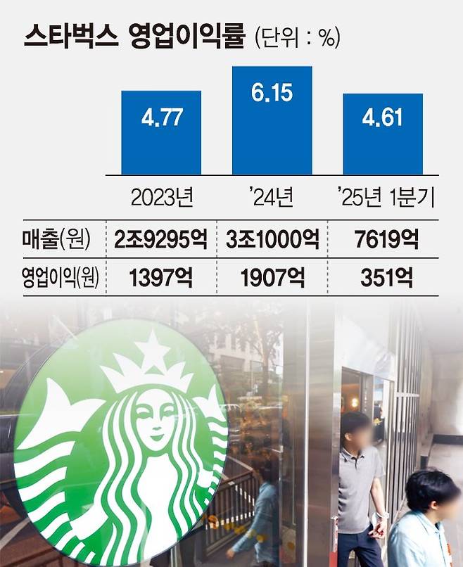 스타벅스의 수익성 개선 노력에도 불구하고 올 1·4분기 영업이익률은 지난해 대비 소폭 감소했다. 스타벅스의 올 1·4분기 영업이익률은 4.61%로 지난해 6.15% 대비 줄었다. 스타벅스 영업이익률은 2021년 당시 10%로 두 자릿수를 찍었으나 2022년 4.7%, 2023년 4.8%로 떨어졌다. 반면 지난해 메가커피를 운영하는 앤하우스 영업이익률은 21.7%로 스타벅스 대비 3배 이상이다.