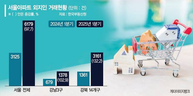 18일 1·4분기 한국부동산원 매입자거주지별 아파트거래현황에 따르면 용산·성동구 등을 포함한 강북 14개구의 외지인 매수건수는 3161건으로 전년 동기 1361건 대비 2.3배 이상 늘었다. 이는 같은 기간 서울 전체 증가폭(3125→6179건, 1.98배)을 웃도는 수치다.
