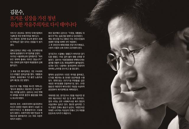 김 후보가 보수 전사로 거듭난 건 2010년 무렵이다. 당시 김 후보는 경기지사 선거에 출마하며 공보물에 민주화·노동운동 이력을 삭제했다. 대신 “태극기만 보면 눈물이 난다” “안보 위기 대한민국의 구원투수” 등의 보수 색채를 앞세웠다. 2018년 공보물에는 “사회주의에 대한 적대감으로 몸부림치던 그는 자유시장주의자가 됐다”는 문구를 넣었다.
