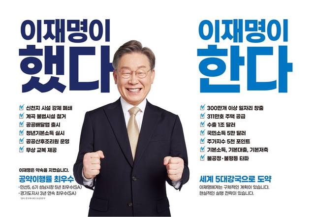 이 후보는 유능한 행정가로서의 면모도 강조했다. 성남시장 재선에 도전한 2014년 선거 벽보에는 ‘일 잘했습니다’ ‘약속 지켰습니다’ 같은 성과 강조 문구에 힘을 줬다. 2018년 경기지사 도전 때도 ‘검증된 이재명, 경기도에서 증명하겠습니다’며 8년간의 성남시정 성과를 앞세웠다.