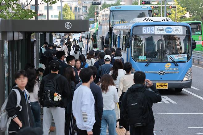 | ▲ 서울의 한 버스 정류장에서 출근길 시민들이 버스에 탑승하고 있다. |