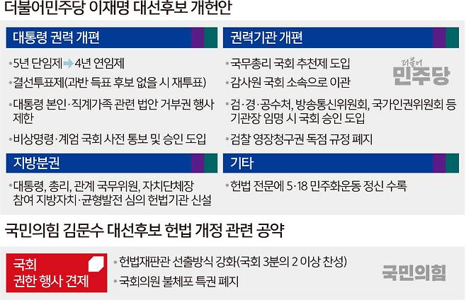 이 후보가 이날 내놓은 개헌안에 맞서 국민의힘 김문수 후보는 ‘21대 대통령 임기 3년으로 단축’ 방안을 핵심 골자로 한 개헌 구상을 내놨다.
