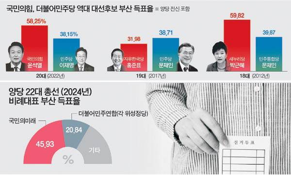 20대 대선 당시 국민의힘 후보인 윤석열 전 대통령과 더불어민주당 이재명 후보는 부산에서 각각 58.25%, 38.15%를 득표했다. 전국적으로 윤 전 대통령(48.56%)과 이 후보(47.83%)가 0.73%포인트 차라는 역대 최소차의 접전을 벌였지만, 부산에서는 20%포인트 격차가 났다.
