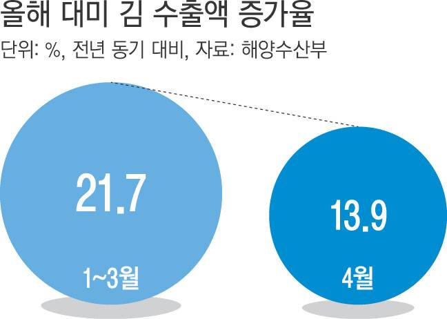 1분기 김의 대미 수출액은 5795만달러로, 전년 동기(4761만달러) 대비 21.7% 증가했다. 반면 지난달 김의 대미 수출액은 2420만달러로, 전년(2124만달러) 대비 13.9% 늘어나는 데 그쳤다.