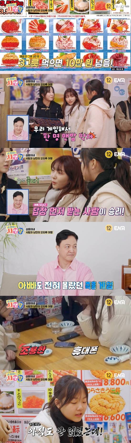 세 자매는 해산물 덮밥 카이센동을 먹으러 향했는데, 한 그릇 당 3만원이 넘는 식사 가격에 놀라움을 감추지 못했다. 결국 세윤 양은 "우리 게임해서 한 명 맨밥 먹자"고 제안했고, 두 동생도 모두 내기에 응했다.