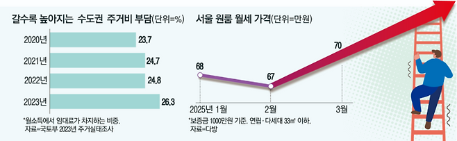 수도권은 월소득에서 임대료가 차지하는 비중(임차가구 RIR)이 갈수록 높아지고 있다. 국토교통부가 작년 12월 발표한 ‘2023년 주거실태조사’에 따르면 전국 평균 RIR은 22.7%를 기록했다. 2020년 20.9%, 2021년 21.5%, 2022년 21.8%로 매년 올랐다. 이는 수도권 평균 RIR이 오른 여파다. 수도권 평균 RIR은 2020년 23.7%에서 2023년 26.3%로 뛰었다. 수도권 임차가구는 월급의 26.3%를 임대료로 쓰고 있다는 의미다.