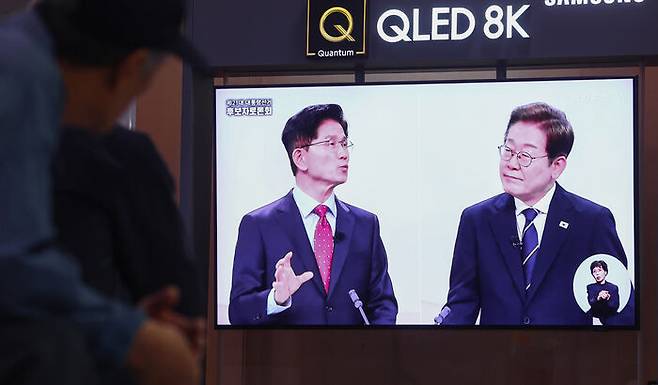 ▲ 18일 서울역 대합실에서 시민들이 제21대 대선 1차 후보자 토론회 중계방송을 지켜보고 있다.