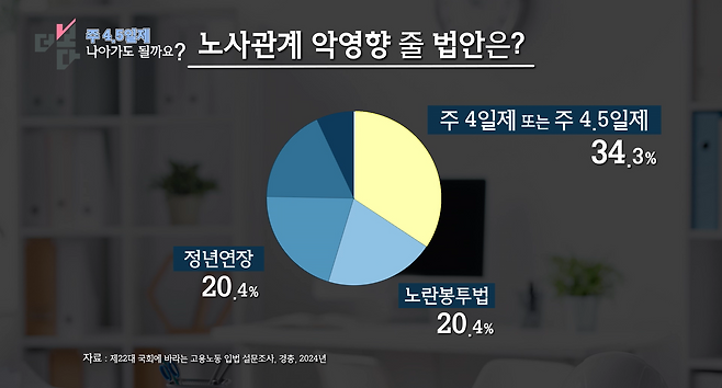 지난해 경총이 200개 기업 임원을 대상으로 설문한 결과 노사관계에 악영향을 줄 것으로 우려되는 입법으로, 응답자의 34.3%가 주 4일제 또는 주 4.5일제를 꼽았습니다.