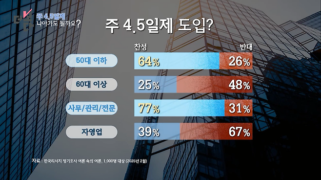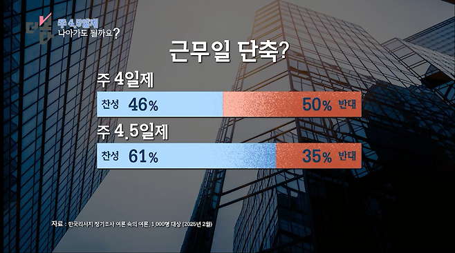 반면 주4.5일제 도입에 대해선 찬성 쪽 의견이 61%로, 반대보다 26%P 앞섰습니다.