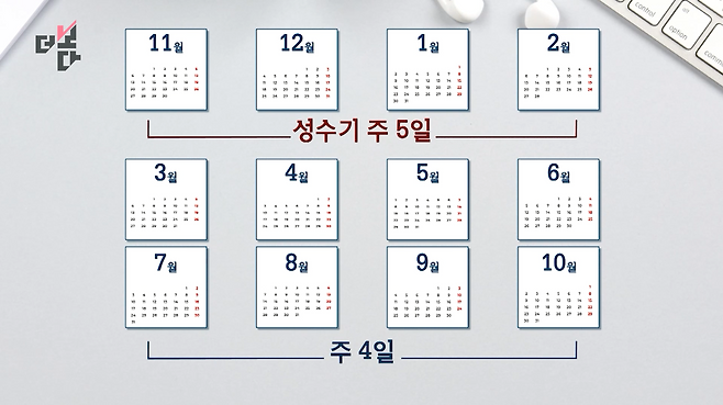 수요가 몰리는 겨울 성수기를 제외하고 8개월은 주 4일 근무를 하는데, 연차를 없앤 대신 2년에 한 번 16일의 휴가가 제공됩니다.