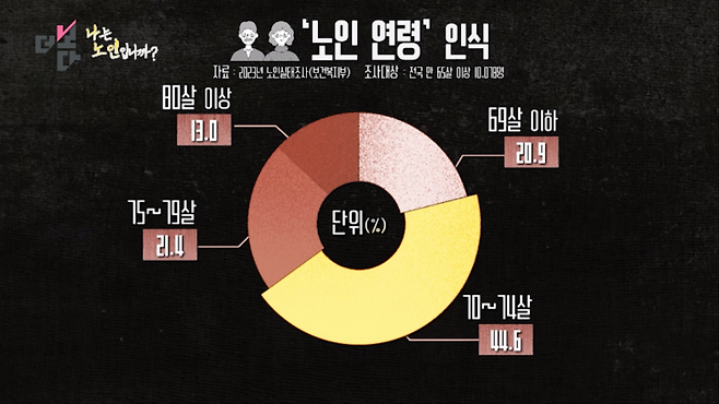 2023년 정부의 노인실태조사에선, 실제 노인들이 노인이라고 생각하는 나이가 평균 71.6세로 나왔습니다. 3년 전 조사보다 평균 1.1세 높아졌습니다.