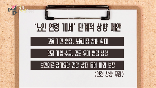 이를 위해선 일자리 고용 기간 연장과 노동시장 참여 기회 확대, 연금 가입·수급 연령과 경로 우대 연령 상향 등도 함께 추진하고, 노인 연령을 올려도 보건의료와 장기요양서비스는 건강 상태 등에 따라 보장해야 한다고 강조했습니다.