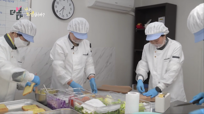 서울의 한 경로당. 노인들이 모여 카페에 공급할 샌드위치를 만들고 있습니다. 하루 두세 시간씩 매일 또는 격일로 일하는데, 개인 나이와 건강 상태에 따라 근무 시간도 다릅니다.