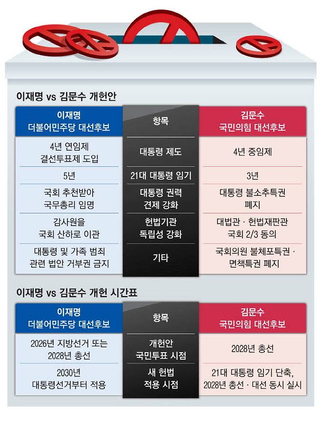 제21대 대통령선거를 불과 보름 앞두고 개헌론에 다시 불이 붙었다. 하지만 더불어민주당과 국민의힘 주장이 주요 논점에서 극명하게 엇갈리고 있어 사실상 정치적 공방의 소재로 전락할 가능성이 커 보인다. 특히 차기 대통령 임기를 3년으로 줄이자는 김문수 국민의힘 대선후보 제안을 이재명 더불어민주당 대선후보가 수용할 가능성은 '제로(0)'에 가깝다.
