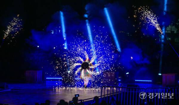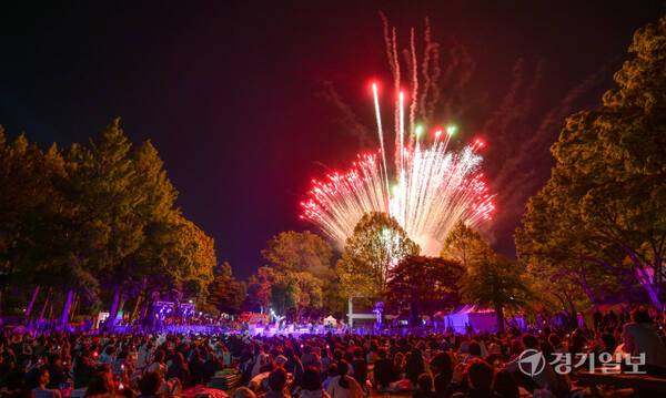 2025 수원연극축제 마지막 날인 18일 오후 수원특례시 권선구 경기상상캠퍼스에서 마지막 공연인 예술불꽃화랑의 '불의 정원'이 멋진 폭죽과 함께 이틀간의 축제를 마무리하고 있다.