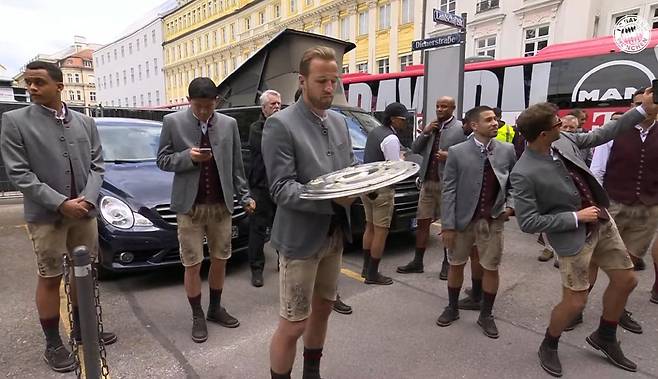 2023년 여름 나폴리에서 뮌헨으로 이적해 올 시즌 리그에서 27경기(2골)를 뛰며 우승에 기여한 김민재는 말끔한 독일 전통 의상 '레더호젠'을 입고 등장했다. 김민재가 회색 레더호젠을 차려입은 건 지난해 9월에 열린 옥토버페스트 이후 처음이다.