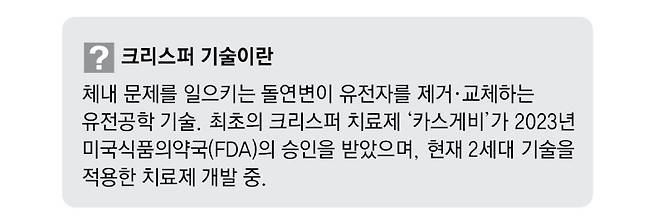 문제 유전자를 반영구적으로 제거할 수 있다는 점에서 크리스퍼 기술은 등장 이후 많은 바이오 기업들의 관심을 받았다. 많은 기업이 크리스퍼 치료제 개발에 뛰어든 결과 2023년 첫 크리스퍼 치료제 ‘카스게비’가 미국식품의약국(FDA)의 승인을 받았다. 혈액에서 산소를 운반하는 헤모글로빈이 유전자 이상으로 낫 모양으로 변하는 ‘겸상적혈구병’ 치료제로, 미국 버텍스파마슈티컬스, 스위스 크리스퍼테라퓨틱스가 공동 개발했다.