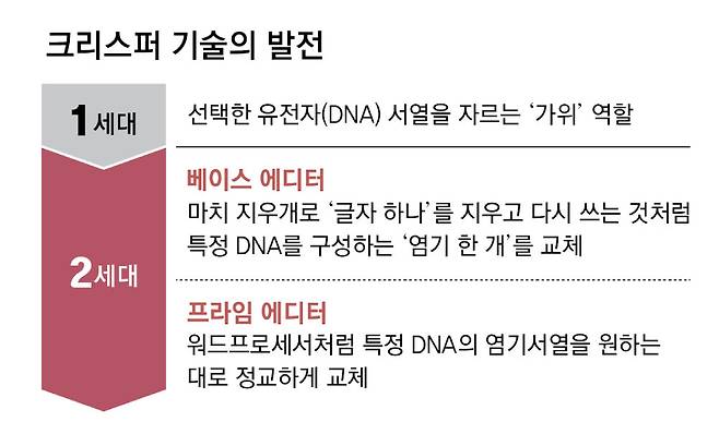 최근에는 유전자를 제거하는 데 그치지 않고 문제 유전자를 잘라내고 원하는 유전자를 삽입하는 2세대 기술도 발전하고 있다. KJ 멀둔의 치료에도 사용된 ‘베이스 에디터’ 기술은 유전자를 구성하는 염기서열 하나를 다른 염기서열로 교체하는 기술이다. 데이비드 류 미국 하버드대 화학생물학과 교수는 여기서 더 나아가 여러 개의 염기서열을 한 번에 교체하는 ‘프라임 에디터’ 기술도 개발했다. 류 교수가 창업한 프라임 메디신은 프라임 에디터 기술을 활용해 희귀질환인 만성육아종증(CGD) 치료제 임상 1·2상을 진행 중이다. 프라임 에디터 기술을 적용한 첫 임상 사례로, 연내 임상 결과를 발표할 예정이다.