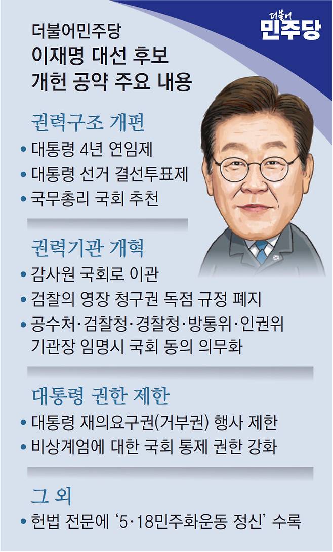 더불어민주당 이재명 대선 후보가 18일 밝힌 개헌 공약의 핵심은 대통령 4년 연임제와 대선 결선투표제, 국회의 국무총리 추천 등 권력구조 개편이다. 대통령의 인사권과 재의요구권(거부권) 등 권한을 축소하고 국회의 견제권을 강화해 권력을 분산하겠다는 것이다. 이 후보는 또 검찰의 영장 청구권 독점 규정 폐지 등 권력기관 개혁안도 내놨다.