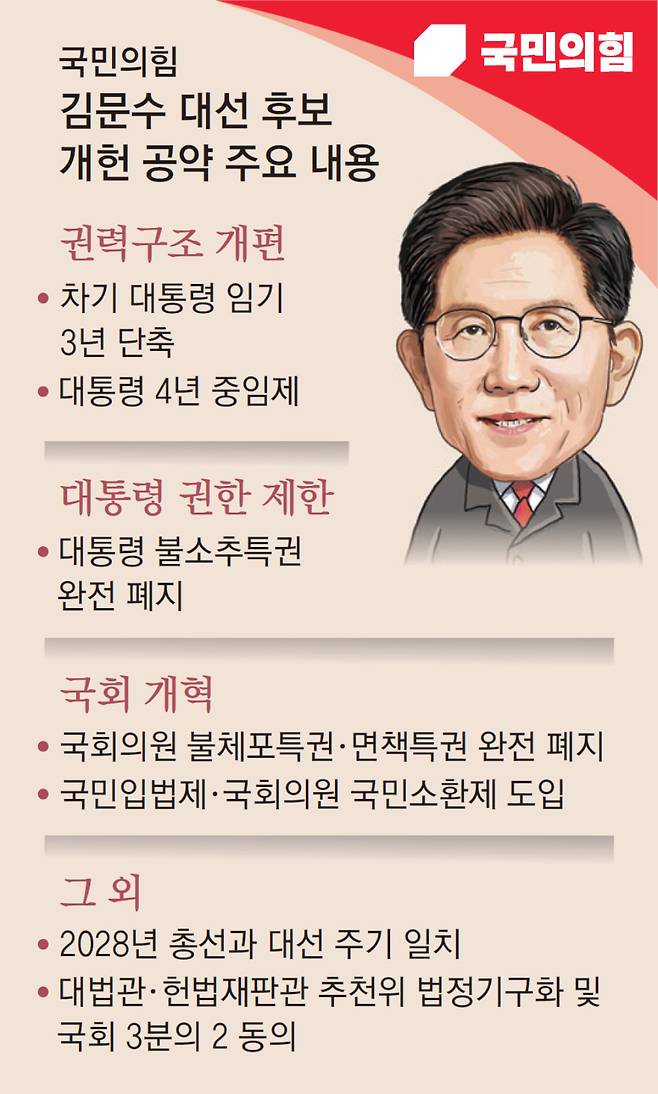 국민의힘 김문수 대선 후보가 18일 내놓은 개헌안은 차기 대통령의 임기를 3년으로 단축해 2028년부터 대통령 4년 중임제를 도입하는 내용이 핵심이다. 김 후보는 대통령 불소추 특권과 국회의원 불체포 특권 및 면책 특권을 완전히 폐지하는 내용도 담았다. 대통령 권한 분산과 함께 국회의 권한을 제한하는 정치 개혁에 방점을 찍은 것이다.