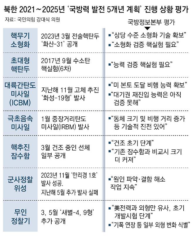 이런 배경으로 김 위원장이 제시했던 국방력 발전 5개년(2021∼2025년) 계획이 올해로 마지막 해를 맞았다. 우리 당국은 김 위원장이 나열한 국방 과업 상당수가 진전된 것으로 평가하고 있다. 한국이 비상계엄 선포와 탄핵 정국으로 정치·사회적 혼란을 겪는 사이 북한은 수단과 방법을 가리지 않고 첨단무기 개발에 몰두해 온 것.