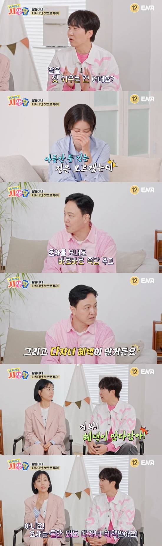 그는 "저희 딸들은 서로 소통하고, 문자를 보내도 바로바로 즉답 주고 아빠 방에 와서 꼭 인사한다"며 "그리고 다자녀 혜택이 많다. 자동차 취득세 같은 거"라고 덧붙여 웃음을 줬다.
