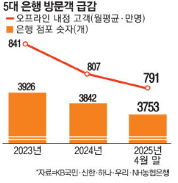 2023년 말 5대 시중은행 점포 수는 3926개였는데, 2024년 4월 말 3753개로 4.4%가 사라졌다.
