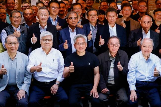 [만찬 행사에서 기념 사진 촬영 중인 젠슨 황 엔비디아 CEO와 TSMC 고위급 관계자들 (로이터=연합뉴스 자료사진)]