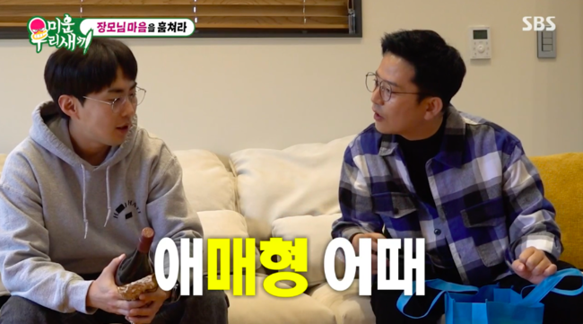 이윽고 도착한 장모님 집. 김준호를 맞이한 건 김지민의 동생이 예비 처남이었다. 그는 도착과 함께 고급 술을 선물하며 예비 처남의 마음을 사로잡으려 노력했다. 그러면서 그는 “처남이라고 불러도 되지 않냐”라고 물었지만 예비 처남은 “저는 그래도 아직 형이라고 말씀 드리고 싶다”라고 선을 그었다.