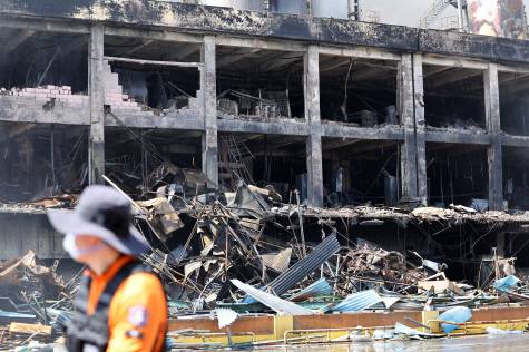 [금호타이어 광주공장 화재 발생 이틀째인 18일 불에 탄 공장 앞으로 소방대원이 이동하고 있다. (사진=연합뉴스)]