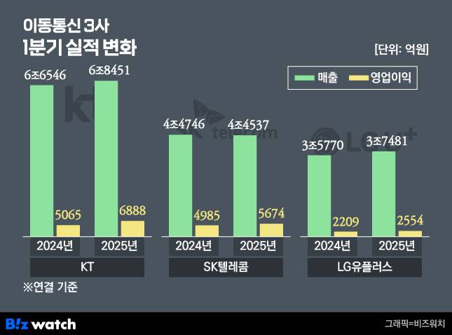 19일 통신업계에 따르면 이통3사의 올해 1분기 연결기준 합산 영업이익은 1조5116억원을 기록했다. 이는 전년 동기보다 23.3% 급증한 수치로 분기 기준 역대 최대다.