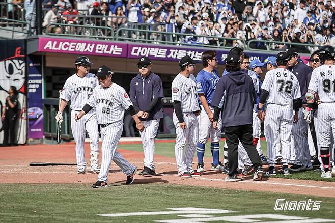 이 상황에서 김태형 감독이 더그아웃을 박차고 나선 뒤 그라운드를 가로질러 삼성 더그아웃을 향해 다가섰다. 손가락질을 하며 고함을 질렀다. 롯데 베테랑 정훈이 저지하려 했지만 뿌리치고 직진했다. 결국 두 팀 선수들이 그라운드로 몰려나왔다. 박진만 삼성 감독이 나와 상황을 설명한 뒤에야 상황이 마무리됐다.