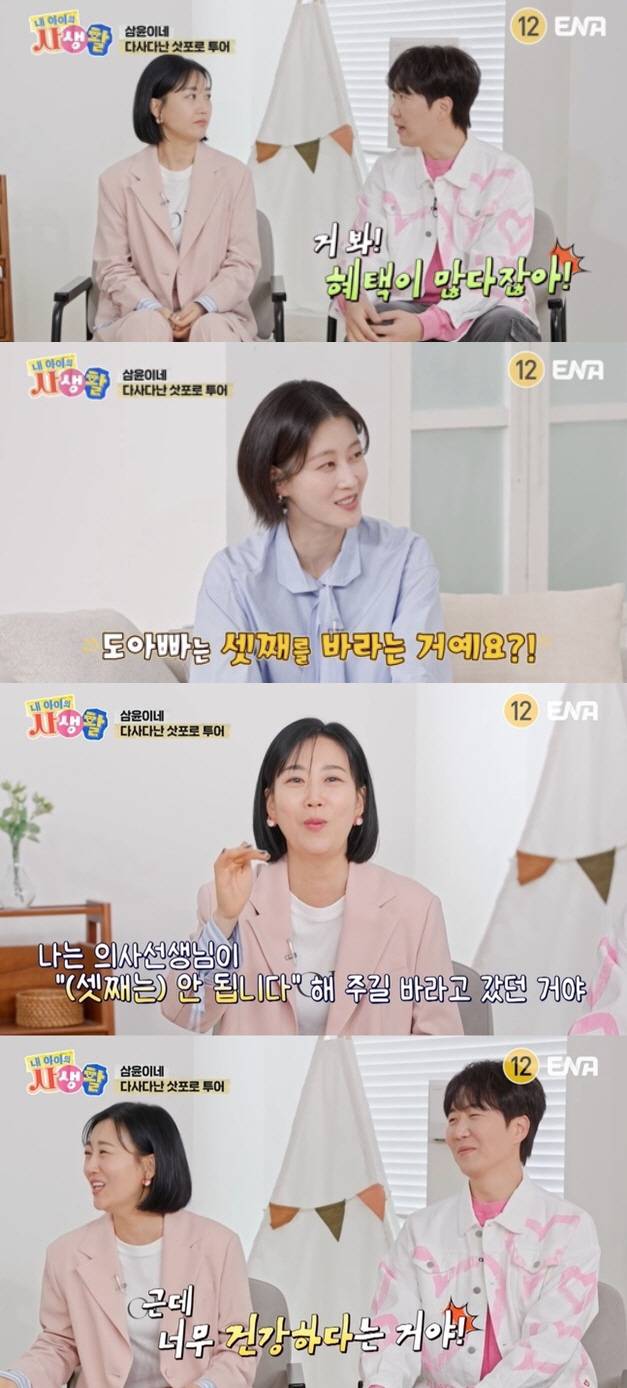 도경완은 "혜택이 많다"며 부러워했고,이현이는 "셋째를 바라는 거냐"고 물었다. 이에 장윤정은 "진짜 계속 이런다. 이거 진심이다. 병원에 가서 검사도 받았다. 나는 의사 선생님이 '안된다'고 해주길 바랐는데 너무 건강하다는 거다"라고 털어놨다.