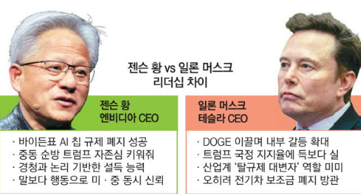 젠슨 황 CEO와 머스크 CEO의 리더십이 가장 극명하게 대조되는 대목은 정교한 조율 능력이다. 머스크 CEO는 트럼프 2기 행정부에서 전방위로 추진되는 전기차 보조금 폐지 정책을 방조하며 동종 업계 불만을 키운 반면, 젠슨 황 CEO는 해결사 역할을 자처하며 실제 과잉 규제를 걷어냈다.