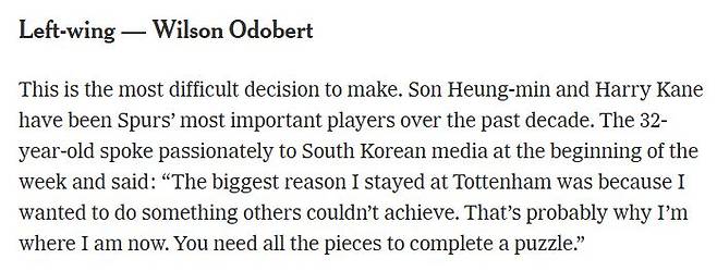 발표한 예상 선발 라인업 분석 기사에는 손흥민 대신 2004년생 윌송 오도베르가 왼쪽 윙 포워드로 선택됐다.