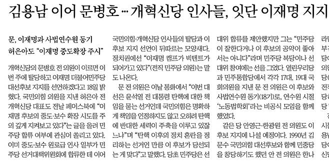 중앙일보에 따르면, 열린우리당에서 인천 지역구 국회의원을 지낸 문병호, 안영근, 한광원이 개혁신당을 탈당하고 이재명 지지를 선언하기로 했다.