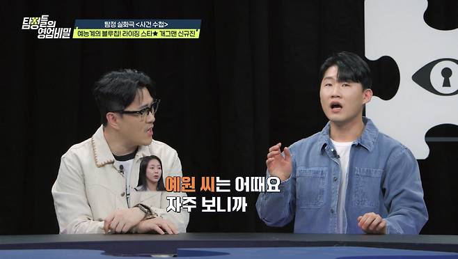 한편 이번 주 '탐정들의 영업비밀'에는 신들린 입담의 '예능계 다크호스' 신규진이 게스트로 함께 한다. 신규진은 웹예능 '노빠꾸탁재훈'에서 '탁재훈의 오른팔'로도 맹활약을 펼치고 있다. 데프콘은 "여성 출연자 중 신호를 준 사람은 없었나, 예원 씨는 어떠냐"라며 신규진의 열애설을 부추긴다. 이에 신규진은 예원과의 관계에 대해 솔직한 입장을 밝힌다.
