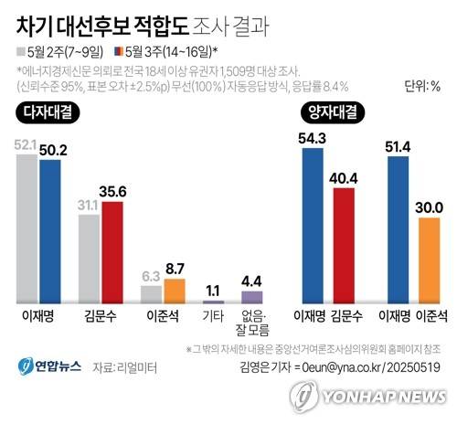 이재명 50.2%로 선두 유지…김문수 35.6% 이준석 8.7%[리얼미터]