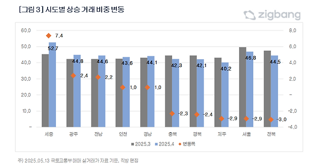 지방에서는 세종시의 상승 거래 비중이 뚜렷하게 증가했다. 세종시의 상승 거래 비중은 52.7%로, 전월(45.3%) 대비 7.4%포인트 증가하며 최근 22개월 중 가장 높은 수준(2023.6월, 53.2% 이후)을 기록했다. 이는 4월 시도별 상승거래 비중 중에서도 가장 높은 수치다. 4월 한 달간 세종시의 아파트 매매 거래량은 총 1197건이었으며, 이 중 631건이 직전 거래 대비 가격이 오른 금액에 거래됐다.