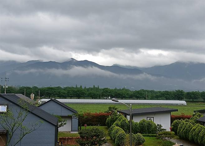 | ▲ 비가 오락가락하는 사이 산과 마을을 덮은 구름과 안개 |