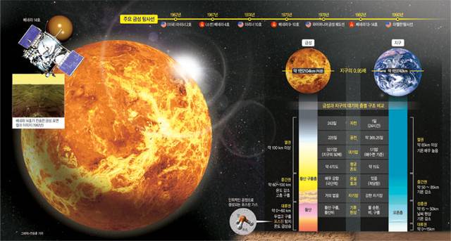 ◇지구와 닮은 ‘죽음의 별’ = 금성은 여러모로 지구와 유사한 물리적 조건을 가지고 있지만, 실제 환경에선 큰 차이를 보인다. 지름 약 1만2104㎞, 표면적 약 4억6000만㎢, 부피는 약 9.28×1011㎦로 어림잡아 지구의 90% 정도 크기다. 질량과 중력도 지구보다 조금 작지만 엇비슷한 수준이다. 이렇듯 지구와 여러 면에서 닮았지만, 평균 표면온도는 약 470도에 대기압은 지구의 92배, 대부분 이산화탄소로 이뤄진 맹렬한 대기를 가지고 있어 탐사선이 표면에 착륙하는 것조차 어려운 환경이다.