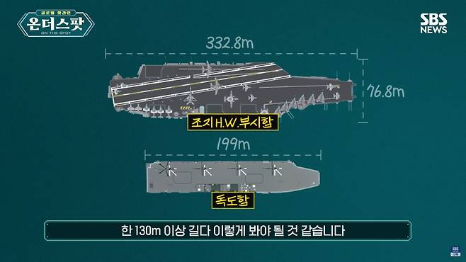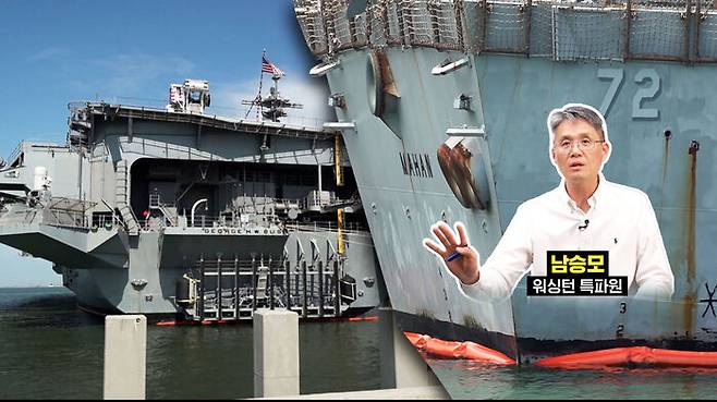 A. 네. 조지 H.W.부시, 아버지 부시 대통령의 이름을 딴 항공모함에 올랐습니다. 10번째 니미츠급 항공모함이자 니미츠급으로는 마지막 항공모함입니다. 제럴드 포드 항공모함을 제외하면 가장 최신이죠. 2009년 1월에 취역한 현역 항공모함입니다. 미국은 핵추진 항공모함이어서 2기의 원자로, 4개의 증기 터빈이 있습니다. 어마어마하게 거대하죠. 18개의 층으로 돼 있습니다. 층고가 낮아서 18층짜리 빌딩 규모는 아니지만 어쨌든 그만큼 거대한 구조물이었고요.